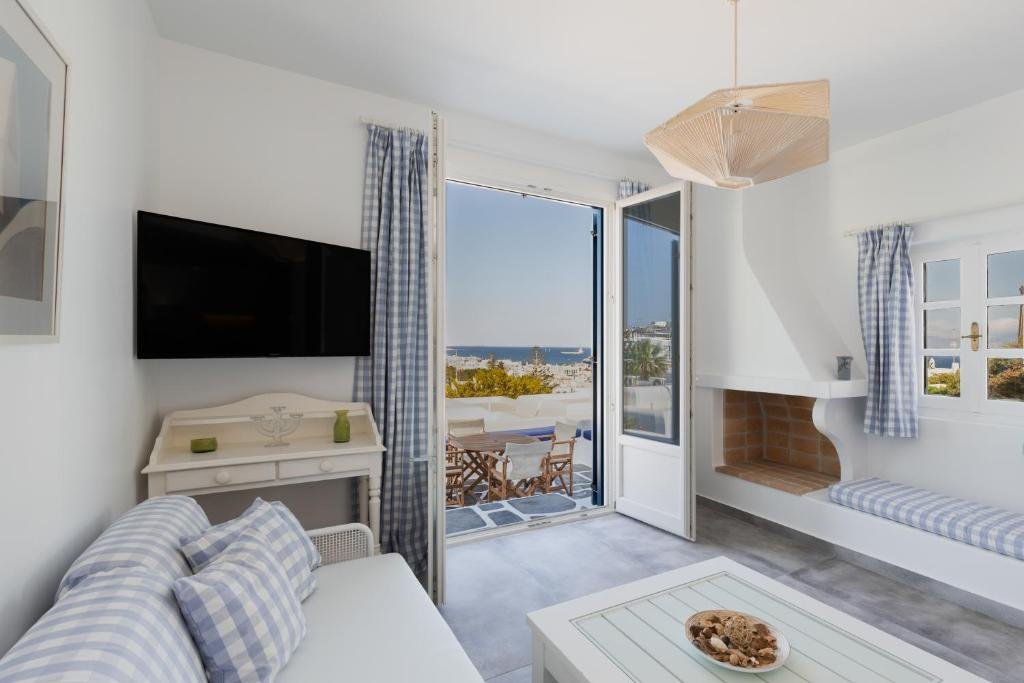 Calypso is a stylish upper-floor 2-bedroom, 2-bath home for up to 4 guests, set in a prime Mykonos Town location. With a private balcony and breathtaking panoramic views over the island, it’s ideal for couples, families, or friends looking for comfort, privacy, and an elevated Mykonos stay.